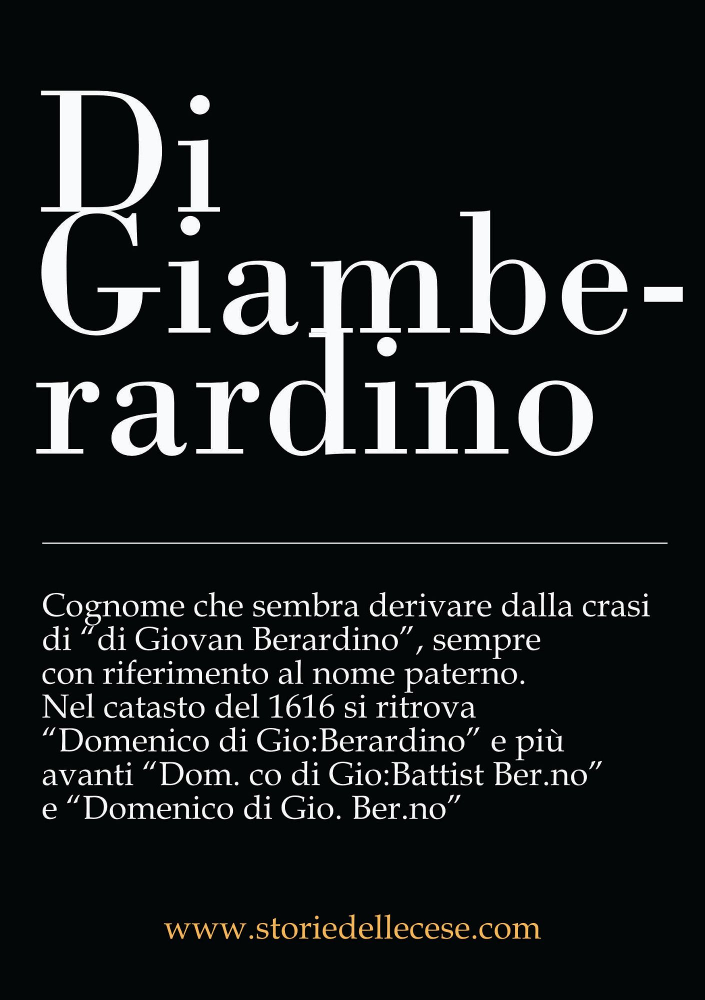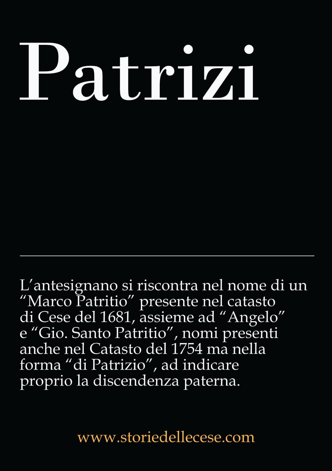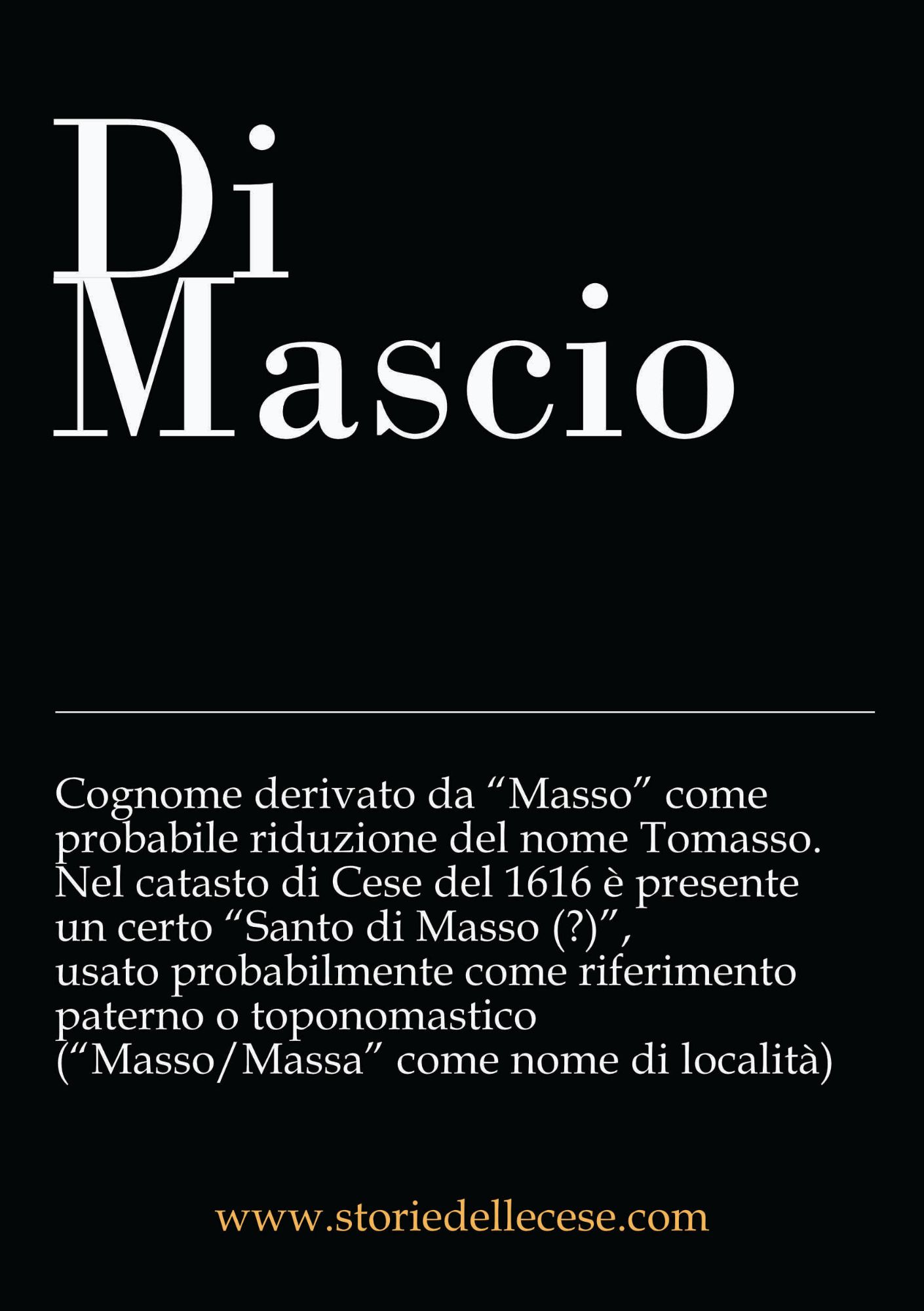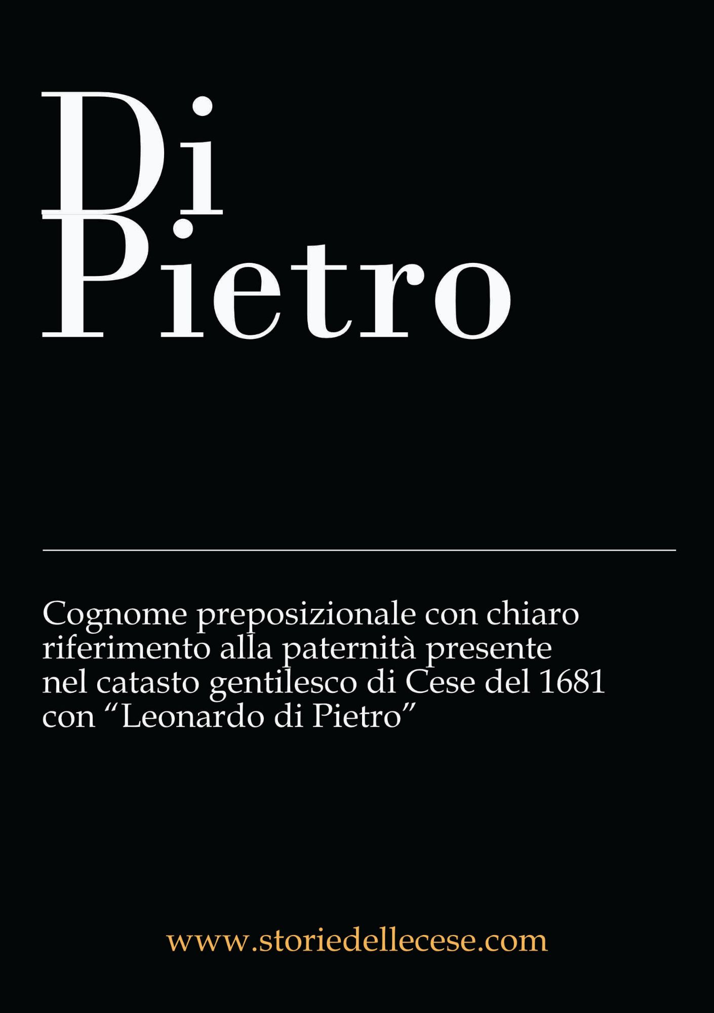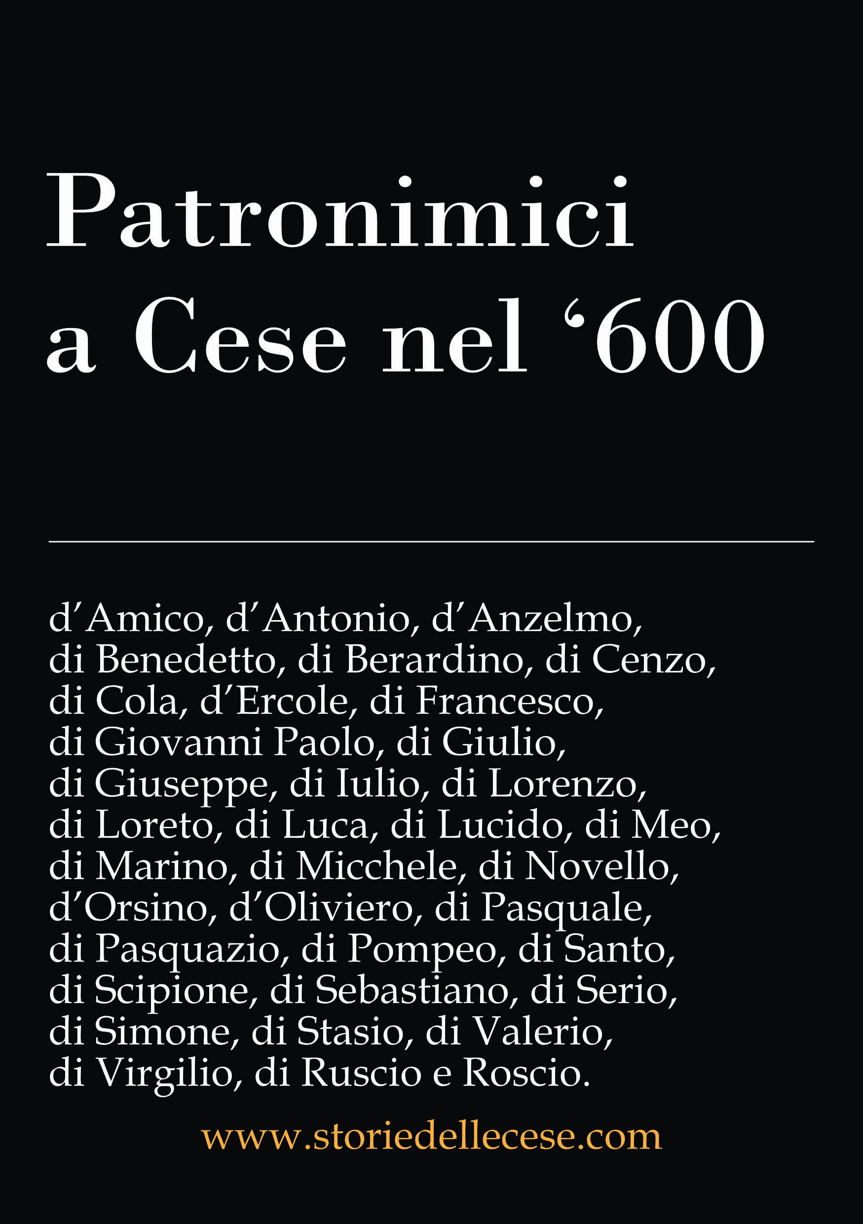 La preposizione “di” e l’equivalente “de”, forma dell’italiano antico e di molti dialetti, risulta d’altra parte presente in moltissimi cognomi contemporanei, chiamati per tale ragione “cognomi preposizionali”. Quando i cognomi non erano ancora fissi, infatti, il nome di battesimo di una persona era accompagnato dal nome del padre in modo che fosse chiaramente identificato. Il semplice “Petrus” o “Pietro”, ad esempio, poteva essere registrato negli atti come “Petrus de Iulio” o “Pietro di Giulio”, appunto ad indicare che era Pietro il figlio di Giulio. Questa pratica non solo aiutava a chiarire le relazioni familiari all’interno di una comunità, ma serviva anche come una sorta di “indirizzo sociale”, permettendo di cogliere rapidamente la posizione e le connessioni di una persona. La formula comprensiva della parte preposizionale, poi, è diventata un cognome a sé stante e molti di questi cognomi sono giunti ai nostri giorni nella propria forma originale. A Cese, nello specifico, la casistica si ritrova agilmente nel cognome DI MATTEO, presente nel catasto gentilesco del 1616 con “Nicola di Matteo” (a cui è aggiunto “pro uxore” ad indicare che la proprietà era in effetti attribuita alla moglie) e in quello del 1754 con “Francesco” e “Luca di Matteo”. Discorso analogo per il cognome DI PIETRO, presente nel catasto del 1681 con “Leonardo di Pietro” e in quello settecentesco con “Lorenzo di Pietro”. Un caso simile ma meno immediato è quello del cognome DI GIAMBERARDINO, che sembra derivare dalla crasi di “di Giovan Berardino”, sempre con riferimento al nome del padre. Nel catasto del 1616 si ritrova infatti “Domenico di Gio:Berardino” e più avanti “Dom. co di Gio:Battista Ber.no” e “Domenico di Gio. Ber.no”, che riportano plausibilmente alla stessa persona. Nei catasti successivi, ossia quello del 1681 e quelli settecenteschi, tale forma non si trova più; di conseguenza, non si può dedurre che il ceppo attuale dei Di Giamberardino sia effettivamente autoctono di Cese poiché potrebbe provenire anche dal circondario, dove il cognome risulta largamente presente. Anche DI MASCIO potrebbe essere un cognome patronimico derivato da “Masso” come riduzione del nome Tomasso. Nel catasto di Cese del 1616, nello specifico, è presente un certo “Santo di Masso (?)”, con probabile riferimento al nome del padre. Potrebbe tuttavia trattarsi anche di un riferimento toponomastico e quindi indicare il luogo di origine; “Masso”, d’altra parte, è il nome di molte frazioni e località, anche nella forma “Massa” (di radice latina con significato di podere, tenimento etc), come la marsicana Massa d’Albe.