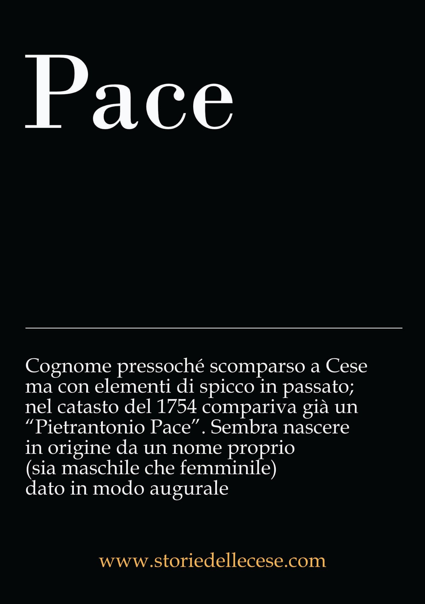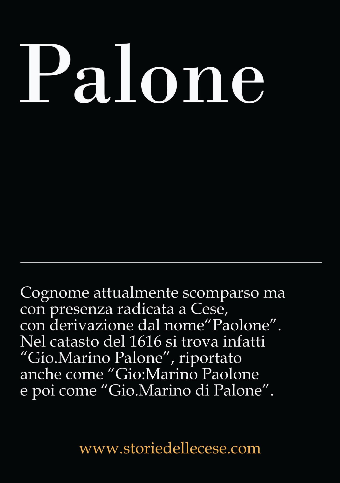 A quest’ultima casistica si contrappone quella dei cognomi presenti a Cese in passato ma attualmente scomparsi. Un caso particolare è quello del cognome PALONE, che in paese risultava presente già in tempi antichi ma che ad oggi è del tutto scomparso, se si eccettua la forma “de Palono” usata però solo informalmente, e non anagraficamente, per indicare il ceppo familiare. A lungo si è infatti ipotizzato che “Palono” e “Paluni” derivassero da soprannomi legati alla particolare altezza media (da “palo”) delle persone identificate con questo “subcognome”, o alla loro particolare abilità lavorativa (da “pala”). Solo recentemente si è appurato che l’origine di questo nome familiare è legata al cognome Palone, anche se si riteneva che quest’ultimo fosse esterno a Cese, dunque acquisito. Stando al registro gentilesco del 1616, invece, si può ipotizzare che la presenza del cognome “Palone” sia del tutto radicata nel nostro paese, e che anch’esso derivi dal riferimento ad un nome, ossia “Paolone”. Nel catasto si trova infatti “Clemente di Paolone” e soprattutto “Gio.Marino Palone”, che nelle righe successive viene riportato come “Gio:Marino Paolone” e poi come “Gio.Marino di Palone”, coincidenza che attesta con buona confidenza la derivazione di “Palone” da “Paolone”. Nel catasto del ‘700 si trova solo la forma Palone nel nome “Pasquale Palone” (così come Felice, Giovanni Marino e Giovanni Paolo). Origina plausibilmente da un nome proprio di persona anche un altro cognome oggi scomparso a Cese, BARTOLUCCI, che però nei registri antichi compare costantemente con la “i” finale. I Bartolucci, facilmente derivanti dal raccorciamento di Bartolomeo in Bartolo e dal successivo vezzeggiativo in Bartoluccio, risultano presenti a Cese già dal 1681 con Francesco Antonio e Luzio. Nel 1754, invece, si ritrovano accanto ai nomi di Francesco (figlio di Domenico) e Pietrantonio, ma sempre con la lettera “i”; attualmente, come scritto, a Cese non vi sono persone con questo cognome. Sorte simile ha subito il cognome PACE, che risulta pressoché scomparso a Cese ma che in passato è stato rappresentato anche da elementi di spicco all’interno della comunità; nello specifico, nel catasto del 1754 compariva già un “Pietrantonio Pace”. Anche in questo caso, il cognome sembra nascere in origine da un nome (sia maschile che femminile) dato in modo augurale.