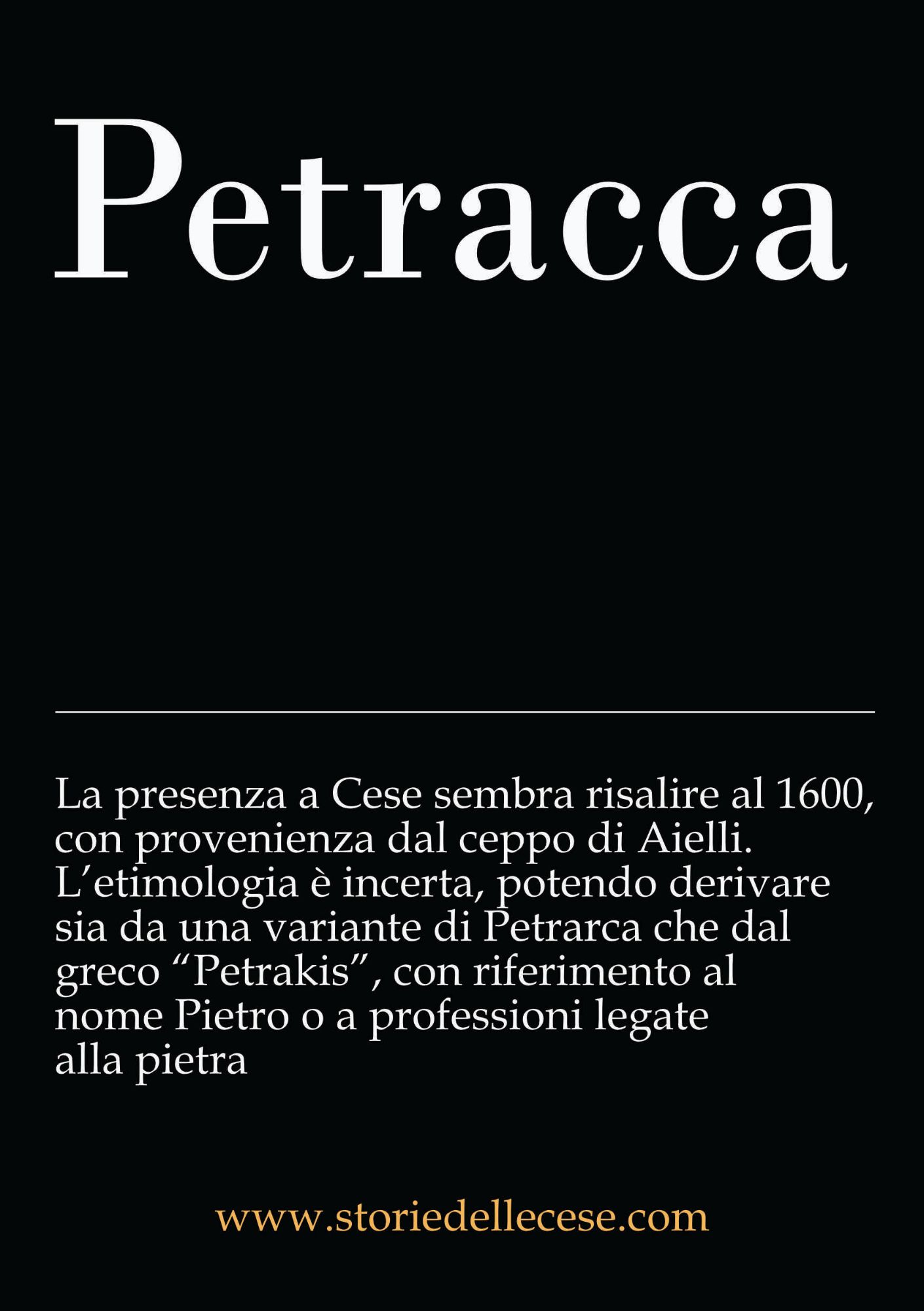 Notizie ancor meno circostanziate sono disponibili ad oggi su altre due cognomi largamente diffusi a Cese, ossia Ciciarelli e Petracca. Il cognome CICIARELLI è piuttosto raro a livello nazionale e si concentra soprattutto nel nostro paese e nell’area romana; è plausibile che si tratti di un cognome autoctono, sebbene nell’indice dei testamenti conservati presso l’archivio di Stato di Roma compaia il testamento di una certa “Teresa Ciciarelli” risalente al 1813. Nei catasti sei/settecenteschi di Cese il cognome Ciciarelli non compare, ma tale evidenza non esclude che lo stesso fosse già presente in paese. Sull’etimologia non si hanno ovviamente certezze; potrebbe derivare da errate trascrizioni di “Ciccarelli” (a sua volta collegabile all’ipocoristico del nome Francesco, ossia “Cecco”), ma anche da una variante di “Cicerello/i”, con un possibile legame con il nome del pesce. Il cognome PETRACCA è invece più diffuso in Italia e la sua presenza a Cese sembra risalire addirittura al 1600, secondo la ricostruzione di Italo Cipollone che ne individua la provenienza dal ceppo di Aielli. L’etimologia è incerta, potendo derivare sia da una variante di Petrarca che dal greco “Petrakis”, con riferimento al nome Pietro o a professioni legate alla pietra. Anche in questo caso, l’assenza del cognome Petracca dagli antichi registri cesensi oggi disponibili non esclude la presenza a Cese in tempi antecedenti a quelli di “Raffaele Petracca”, primo capostipite attualmente accertato in paese a fine ‘700. Come Ciciarelli e Petracca, altri cognomi oggi diffusi a Cese non hanno traccia nei registri sei/settesecenteschi, ma si tratta in questo caso di un’origine esterna al paese, così come teorizzato da Italo Cipollone nella sua ricerca. Secondo tale ricostruzione, infatti, il cognome Bruno è giunto a Cese da Ovindoli (1800), Chiostri da Corcumello (1780), Contaldi da Napoli o da Lecce (1800), Di Fabio da Cappadocia (1800), D’Innocenzo da Civita d’Antino (1800), Faonio da Luco dei Marsi (‘900), Galdi da Salerno (1700), Guidoni da Capistrello (1870), Rantucci da Ovindoli (1800), Scafati da Scurcola Marsicana (1830) e Tucceri da Cerchio (1770).