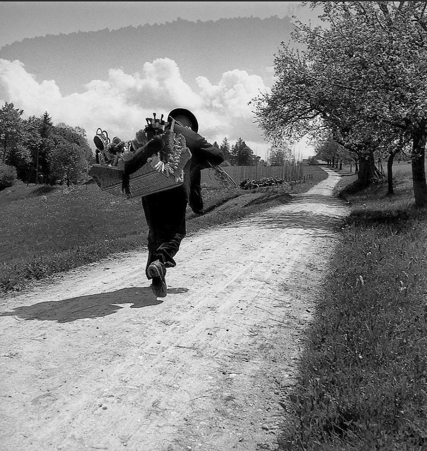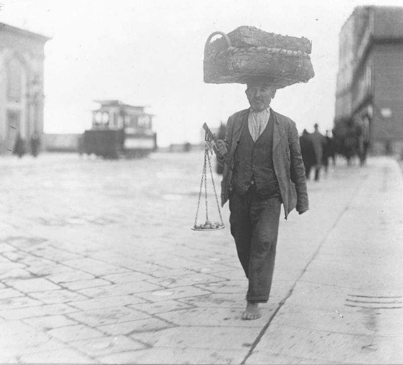 Nei secoli scorsi, diversi beni di consumo arrivavano nei paesi grazie ai venditori ambulanti, che giravano con e senza licenza per proporre la propria merce consistente essenzialmente in generi alimentari, tessuti e chincaglieria, mentre altri ambulanti offrivano non beni ma servizi, primi fra tutti quelli di riparazione e sistemazione. Tutti si muovevano a piedi o con carretti spinti a mano o trainati da animali; dai primi anni del ‘900 hanno cominciato ad utilizzare anche la bicicletta, spesso adattata alle specifiche esigenze, mentre nel secondo dopoguerra sono comparsi i furgoni a tre ruote, le automobili e poi i furgoni più grandi. Già prima, anche Cese era frequentata da diversi ambulanti, che si fermavano spesso in piazza o attorno alla fontana per pubblicizzare la propria mercanzia o il proprio servizio, servendosi anche dei richiami del banditore che annunciava la loro presenza ricevendo in cambio pagamenti in natura (specialmente se si trattava di commercianti di pesce, frutta o altri beni alimentari). In particolare, in passato era consuetudine che dopo la trebbiatura giungessero in paese diversi venditori ambulanti per barattare fichi e pere con una certa quantità di grano nuovo; d’altra parte, a Cese la produzione di frutta è stata sempre limitatissima per le condizioni climatiche, per cui quella proposta dagli ambulanti aveva larga richiesta. Un oggetto tipicamente associato ai fruttaróji era la stadèra, una bilancia manuale di uso domestico e commerciale per il peso di modeste quantità. Oltre ai fruttaróji, tra gli ambulanti si ricordano facilmente jo piattaro e j’ombrellaro (che spesso coincidevano con la stessa persona), jo spezzino, j’arrotino, jo cinciaro, jo scarparo, jo carbonaro, jo ferrivécchi e anche quijo che ffaceva a càgna a ssimmia (la semola). Alcuni nomi, in particolare, sono entrati nella memoria comune, come quiji de Capistréjjo, tra cui Claretta, Elena e Gioseppo, che arrivavano in paese soprattutto per vendere lupini, frutta e mercanzia varia. Da Castellafiume giungevano invece altri venditori ambulanti che portavano a spalla scale a pioli, stai, setacci, crivelli, battilardo, rastrelli ed altri utensili in legno. Scavalcavano a piedi il monte che li separava dai Piani Palentini portando con sé ogni sorta di attrezzi agricoli e da cucina, ma anche giochi come “raganelle”, trottole, ruzzole e bocce, oggetti che gli ambulanti barattavano molto spesso con prodotti della campagna. Tra tutte le figure, la più affascinante era forse quella dejjo cinciaro, che girava i paesi con un sacco in spalla per raccogliere tessuti usati e, soprattutto, una valigia piena di chincaglierie come forbicine, pettini, centimetri, bottoni e lacci per scarpe, occhiali, scatole di lucido, spazzole, rocchetti, scatoline, flaconi, elastici, specchietti… Tra le voci della memoria è certamente rimasto il suo tipico richiamo, così come la parlata forestiera: “È arrivate je cinciare. Tènghe: aghi, spilli, spécchi… Occhiali pe’ li vécchi… Porte pure: forbecette, ditali, spazzole, pettini, rocchetti, lacci e cromatina, liacce, centimetre, elastiche pe’ le calze e pe le mutande, pettenesse, strecce pe’ li pidocchi, fermagli, férri pe’ ffa’ le maglie, uncinetti e atre robbe ancore. Escéte femmene, portete li stracci e le maglie vecchie!”.