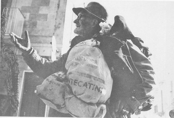 Per raggranellare qualche moneta da spendere alle bancarelle durante le feste patronali o per acquistare oggetti di svago, i ragazzi di un tempo si ingegnavano in diversi modi, alcuni dei quali assolutamente originali. Sfruttando il fatto che il paese era frequentato anche da carrettieri e riciclatori di materiale vario, come gli straccivendoli e i ferrivecchi, i ragazzi s’impegnavano infatti ad accumulare ferraglia, vecchi tegami d’alluminio e ogni sorta di secchi e contenitori dismessi per poi consegnarli a chi li ritirava, al prezzo di 100 o 200 lire al chilogrammo a seconda del metallo[1]. Dopo aver adeguatamente schiacciato il materiale per ridurne la voluminosità, i giovani ponevano gli oggetti sulle stadère per verificarne peso e relativo valore e raggranellavano così modeste somme per le proprie spese alle bancarelle. C’è da considerare, a tale riguardo, che per la quasi totalità delle persone non sussisteva al tempo la possibilità di fare acquisti “futili”. Talvolta le mamme omaggiavano i ragazzi con qualche moneta, raccomandando parsimonia ed oculatezza, o addirittura invitando a non spendere affatto. I più scaltri, tra i giovani, trafugavano anche granaglie o altri prodotti per poi rivenderli ai commercianti ambulanti; altri raccoglievano le pannocchie di mais lasciate sui campi, le sgranavano, le facevano essiccare e vendevano il granturco a commercianti abituali, come Giuseppe, Claretta e Tonino, i quali li ricompensavano con qualche modesta moneta che regalava loro la soddisfazione di spendere denaro proprio per una gassosa, un gelato, o una puntata a “mazzitto” o alla “ruota”. Il tempo di una speranza, di uno sfizio, prima che gli ambulanti ripartissero e lasciassero ai ragazzi e ai grandi l’attesa del ritorno.