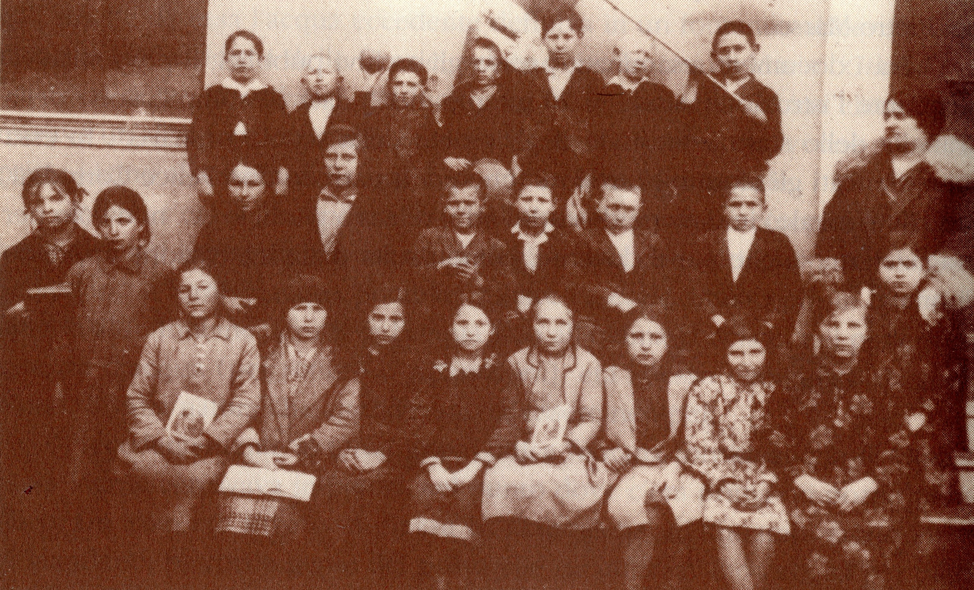 Fila centrale (in piedi) da sinistra: Linda e Lauretta Cipollone – Checchina Micocci – Lina Tomei – Giuseppe Cipollone (Peppetto) – Ivo Marchionni – Antonio Torge – Benedetto Marchionni – Giovannina Cipollone (di Vincenzino) davanti alla maestra Costantina.
