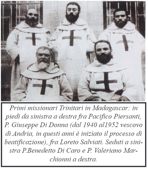Come Padre Valeriano, anche Padre Carmine Cipollone ha dedicato di fatto la propria intera all’impegno missionario, rimanendo in Madagascar da trinitario per oltre 65 anni. Alla morte, avvenuta nel 2021 a 93 anni, è stato ricordato con una significativa memoria dalla Curia generalizia dell’ordine dei Trinitari: “P. Carmine Cipollone è deceduto il 9 giugno 2021. Era nato ad Avezzano, L’Aquila, Italia, il 18 gennaio 1928, figlio di Enrico Cipollone e Filomena Cosimati. Entrò nell’Ordine della Santissima Trinità e degli Schiavi e il 25 novembre 1943 iniziò il noviziato a Palestrina, Roma (Italia). Pronunziò la prima professione a Roma il 26 novembre 1944 e il 3 febbraio 1949 mise la professione solenne ad Anagni. Fu ordinato sacerdote a Roma il 26 ottobre 1952. Tre anni dopo l’ordinazione sacerdotale, fu inviato alla missione trinitaria in Madagascar, dove arrivò nel giugno 1955. Nel 1978 andò a studiare la Missiologia a Roma, dopo la specializzazione tornò di nuovo in Madagascar. L’Ordine lo inviò a Moramanga nel 1981, per continuare la costruzione della Parrocchia “Santuario della Santissima Trinità”, nonché la casa del noviziato. È stato nominato “Maestro dei Novizi” dal 1984 fino al 2003. Circa 55 dei sacerdoti e frati della provincia Nostra Signora del Buon Rimedio (Madagascar) sono stati formati da P. Carmine nel noviziato. P. Carmine Cipollone è stato veramente un religioso modello in tutto e per tutto: con amore per la preghiera, con amore per lo studio e la ricerca, con amore per il lavoro e con amore per i fratelli e per il prossimo. Un sacerdote e un missionario che ha offerto la sua vita con zelo nel ministero. Ringraziamo Dio Trinità per avercelo donato. Che possa contemplare eternamente il volto di Dio Trinità che ha cercato senza sosta sulla terra. R.I.P.”