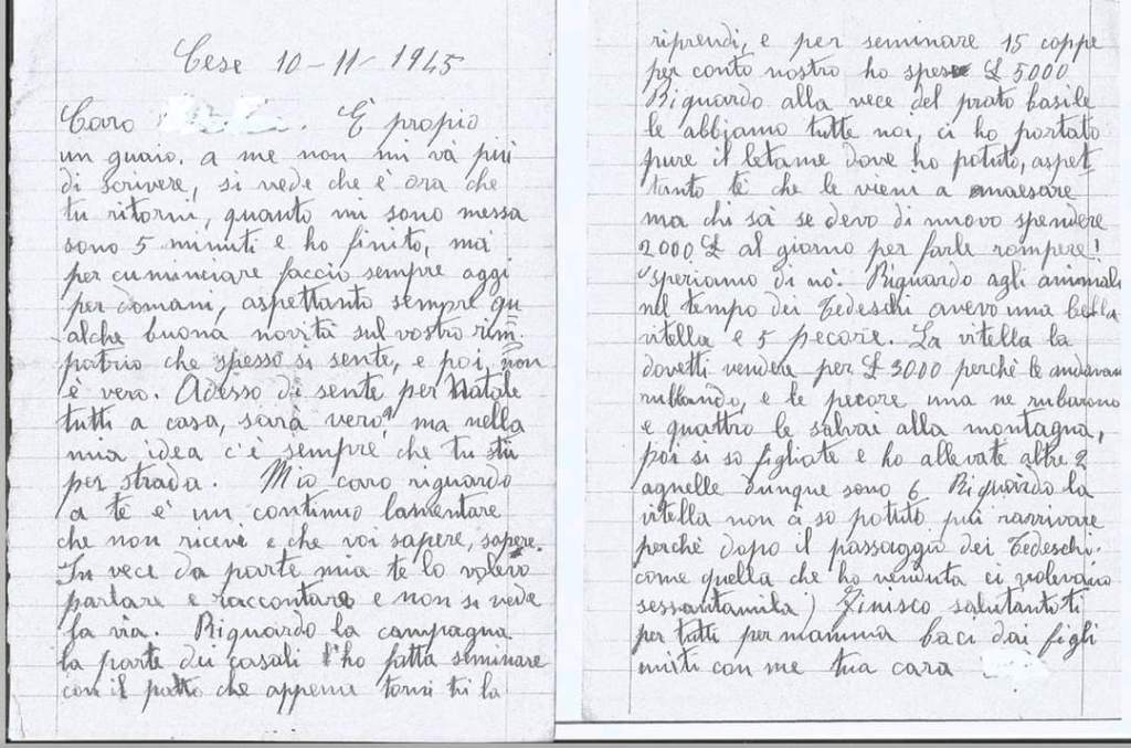 «Cese, 10 novembre 1945. Caro —. È proprio in guaio, a me non mi va più di scrivere, si vede che è ora che tu ritorni. Quando mi sono messa, sono 5 minuti e ho finito, ma per cominciare faccio sempre oggi per domani, aspettando sempre qualche buona novità sul vostro rimpatrio che spesso si sente, e poi non è vero. Adesso si sente “per Natale tutti a casa”, sarà vero? Ma nella mia idea c’è sempre che stai per strada. Mio caro, riguardo a te è un continuo lamentare che non ricevi e che vuoi sapere, sapere. Invece da parte mia ti volevo parlare e raccontare e non si vede la via. Riguardo la campagna, la parte dei Casali l’ho fatta seminare con il patto che appena torni tu la riprendi, e per seminare 15 coppe per conto nostro ho speso 5.000 lire. Riguardo alla vece del Prato Basile le abbiamo tutte noi, ci ho portato pure il letame dove ho potuto, aspettando te che le vieni a maesare ma chissà se devo di nuovo spendere 2000 lire al giorno per farle rompere! Speriamo di no. Riguardo agli animali, nel tempo dei Tedeschi avevo una bella vitella e 5 pecore. La vitella la dovetti vendere per 3.000 lire perché le andavano rubando, e le pecore una ne rubarono e quattro le salvai alla montagna, poi si sono figliate e ho allevate altre 2 agnelle, dunque sono 6. Riguardo la vitella non ci sono potuta più riarrivare perché dopo il passaggio dei Tedeschi come quella che ho venduta ci volevano sessantamila lire. Finisco salutandoti per tutti per mamma, baci dai figli uniti con me tua cara —».