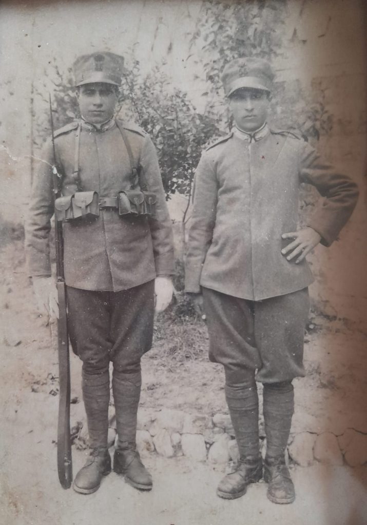 Sulla Guerra d’Etiopia è emerso finora un unico racconto, relativo alla partecipazione di Vincenzo Di Matteo (“Metetóro”), classe 1904, che all’epoca del conflitto aveva 31 anni ed era già sposato con Vittoria Tucceri, dalla quale aveva avuto già quattro dei suoi figli (dieci in totale, di cui sette rimasti in vita). Nella foto qui riportata, relativa proprio al periodo della guerra d’Etiopia, Vincenzo è ritratto con il suo amico Nicodemo.