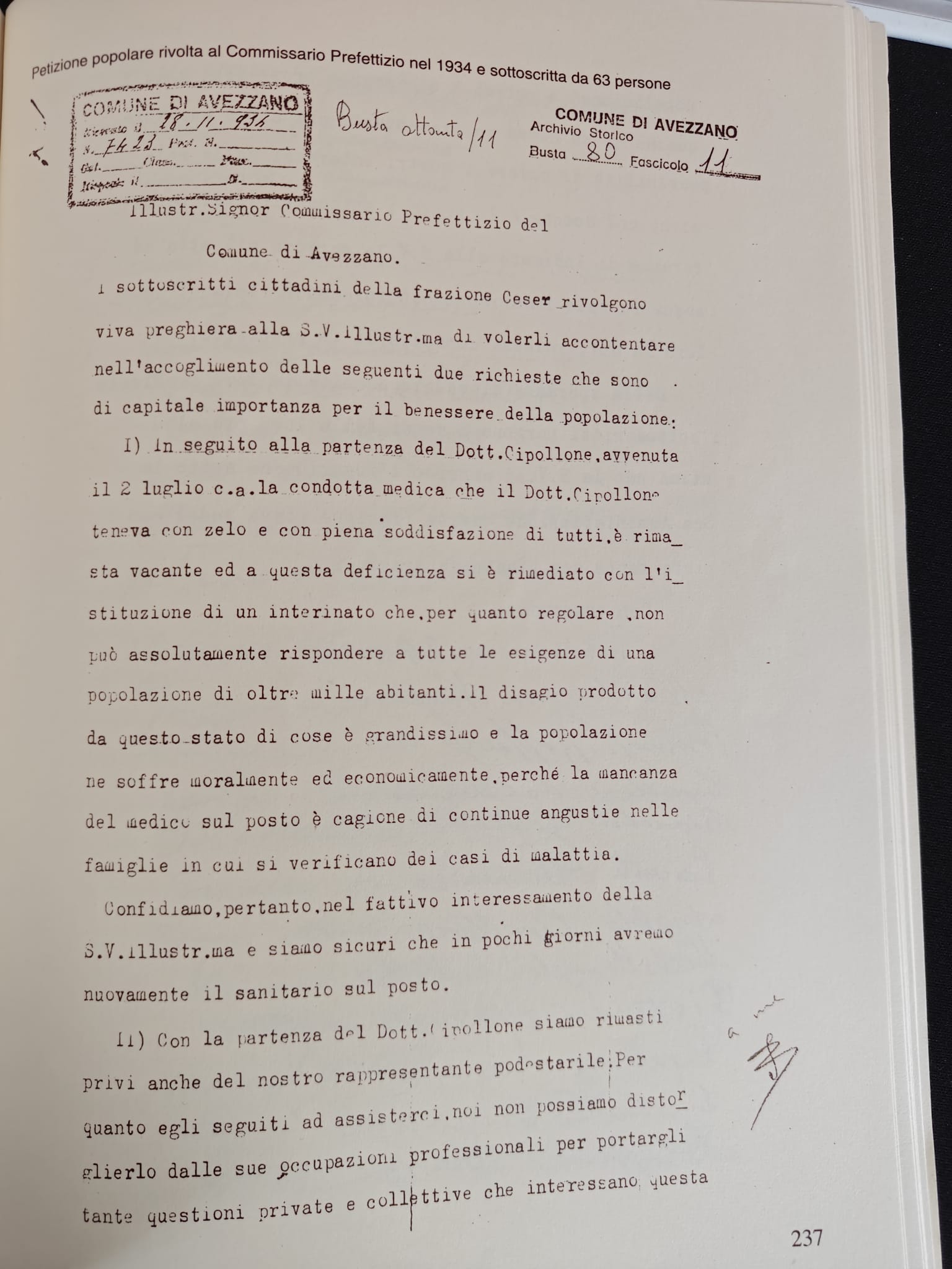 I sottoscritti cittadini della frazione Cese rivolgono viva preghiera alla S.V. illustr.ma di volerli accontentare nell’accoglimento delle seguenti due richieste che sono di capitale importanza per il benessere della popolazione:I) In seguito alla partenza del Dott. Cipollone, avvenuta il 2 luglio c.a., la condotta medica che il Dott. Cipollone teneva con zelo e con piena soddisfazione di tutti, è rimasta vacante ed a questa deficienza si è rimediato con l’istituzione di un interinato che, per quanto regolare, non può assolutamente rispondere a tutte le esigenze di una popolazione di oltre mille abitanti. Il disagio prodotto da questo stato di cose è grandissimo e la popolazione ne soffre moralmente ed economicamente, perché la mancanza del medico sul posto è cagione di continue angustie nelle famiglie in cui si verificano dei casi di malattia. Confidiamo, pertanto, nel fattivo interessamento della S.V. illustr.ma e siamo sicuri che in pochi giorni avremo nuovamente il sanitario sul posto.