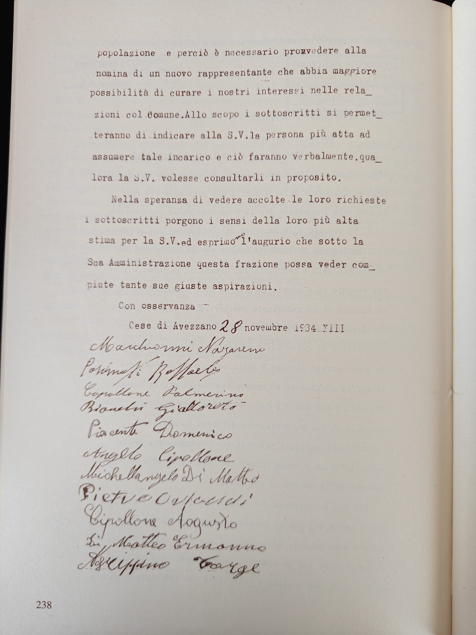Diverse sono state, nel tempo, le istanze che gli abitanti di Cese hanno rivolto direttamente alle massime cariche comunali. Nel 1934, in particolare, 63 capifamiglia sottoscrissero una petizione popolare diretta al Commissario Prefettizio del tempo, Silvio Bonanni, che di lì a pochi mesi sarebbe diventato podestà di Avezzano ed avrebbe guidato il Comune fino al 1938. Si era in piena epoca fascista, tant’è vero che, accanto alla data di sottoscrizione della petizione (28 novembre 1934), i firmatari riportarono anche il numero romano XIII, in riferimento al 13° anno dell’era fascista. Oggetto dell’istanza era la richiesta d’intervento ed ascolto da parte del Commissario Prefettizio per la sostituzione del dottor Giocondo Cipollone non solo in qualità di medico condotto, ma anche di “rappresentante podestarile” del paese. È questa seconda carica, nello specifico, a detenere un interesse particolare, perché dà segno di una rappresentanza diretta del massimo livello di potere comunale anche a Cese. Si tratta di un caso strettamente legato sia alla particolare figura del podestà che a quella – altrettanto particolare e degna di nota – del dottor Cipollone, che proprio in quegli anni sarebbe diventato segretario del Fascio di Avezzano. Due aspetti emergono da questa seconda parte della petizione. Il primo: era evidentemente al rappresentante locale che la popolazione di Cese portava tutte le “questioni private e collettive” da sottoporre all’attenzione dell’amministrazione. Il secondo: almeno nelle proprie intenzioni, gli abitanti di Cese potevano “indicare la persona più atta” a sostituire la figura del rappresentante locale tramite una loro consultazione diretta. Si tratta di una circostanza che va naturalmente contestualizzata e che risente, come anticipato, del particolare ruolo del dottor Cipollone, ma rappresenta comunque un caso particolarissimo di relazione con l’amministrazione comunale. La petizione, inoltre, contiene la testimonianza calligrafica di molti dei nostri antenati e dà segno di un ampio coinvolgimento e di un costruttivo spirito di iniziativa da parte di tante famiglie di Cese, che auspicavano di “veder compiute tante giuste aspirazioni” della frazione.